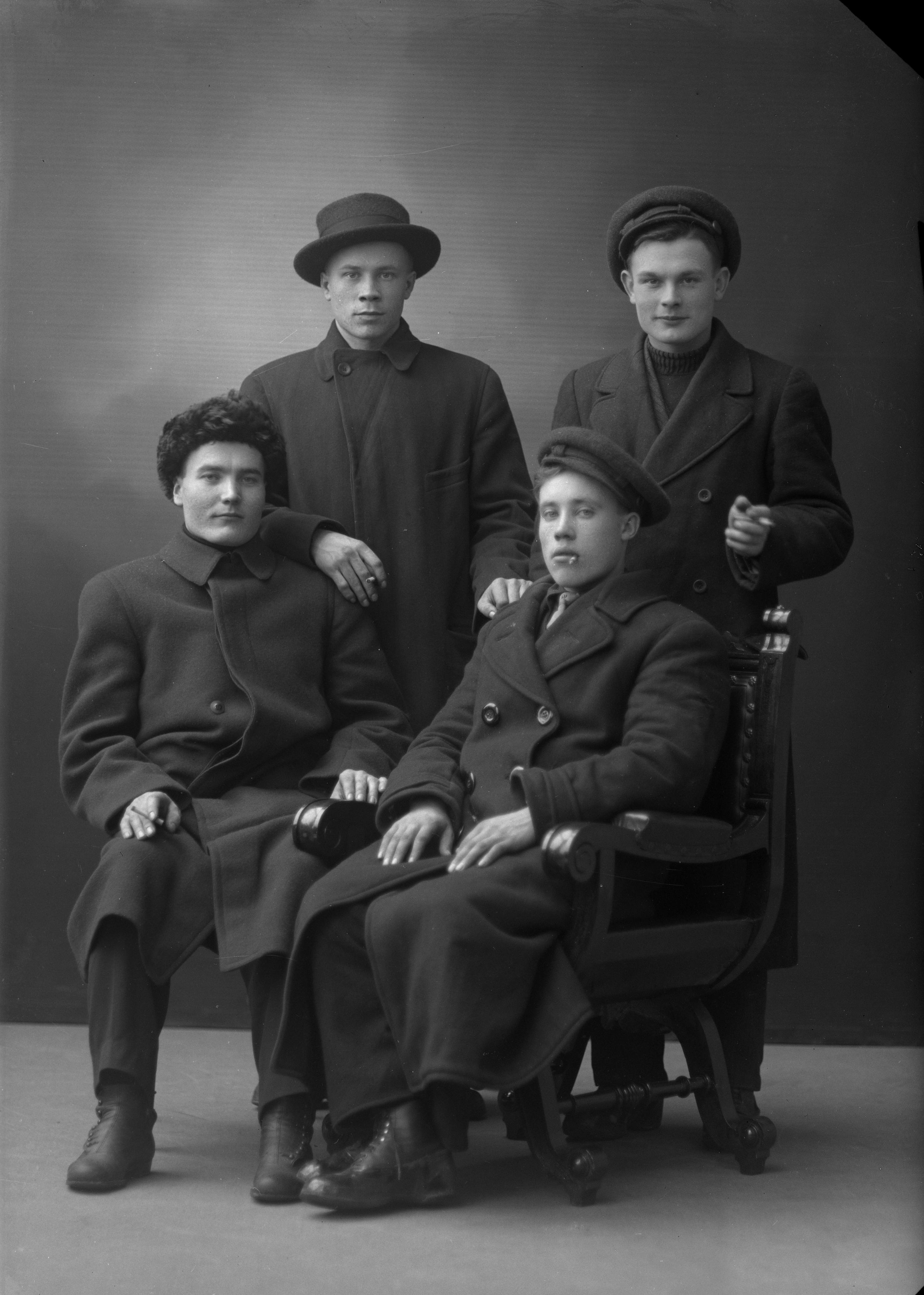 Porträtt i helfigur av Johannes Ingvar med okänt sällskap, sittande och stående. Tre av männen håller cigaretter eller cigariller.