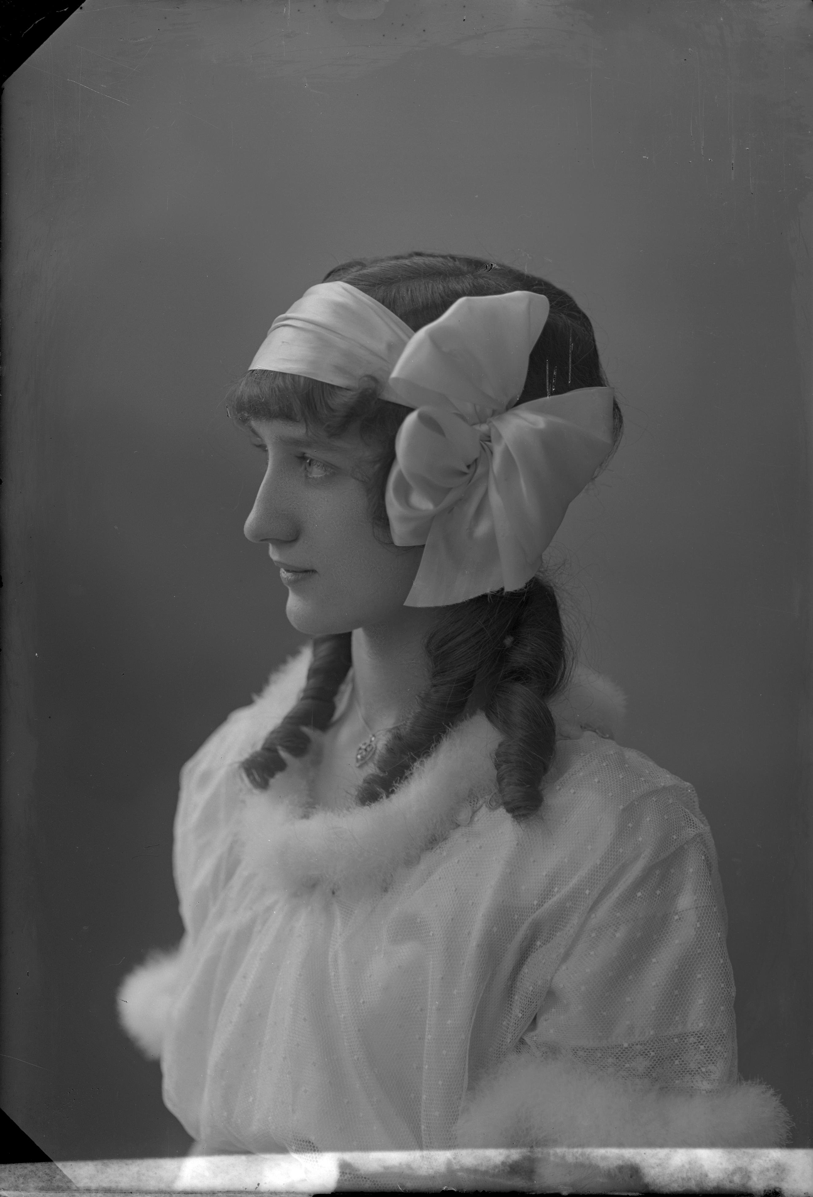Porträtt i halvfigur av fröken Olsson i brett hårband, ansikte i profil.