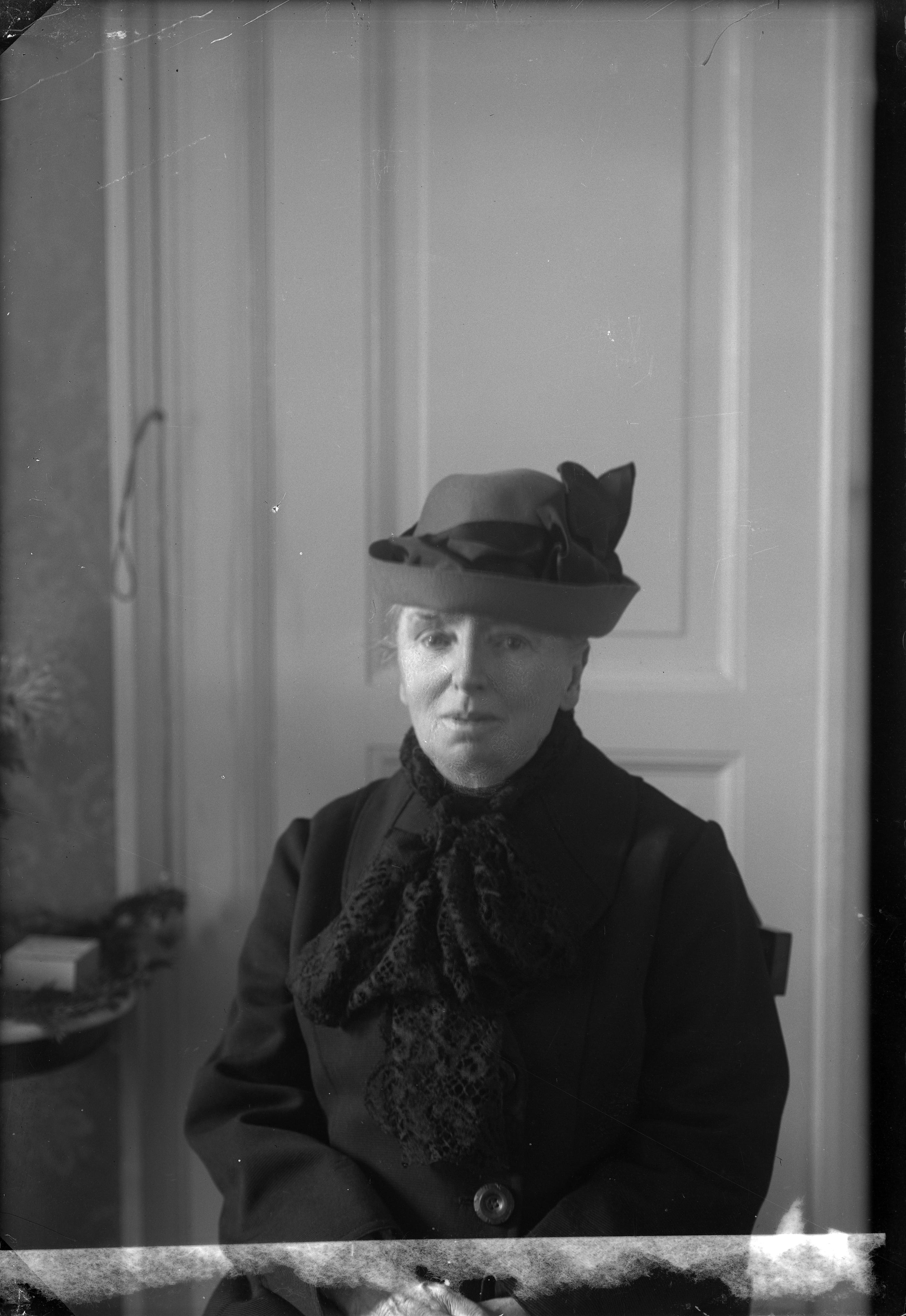 Porträtt i halvfigur av Mary Christensson i hatt och kappa, hållande handmuff.
