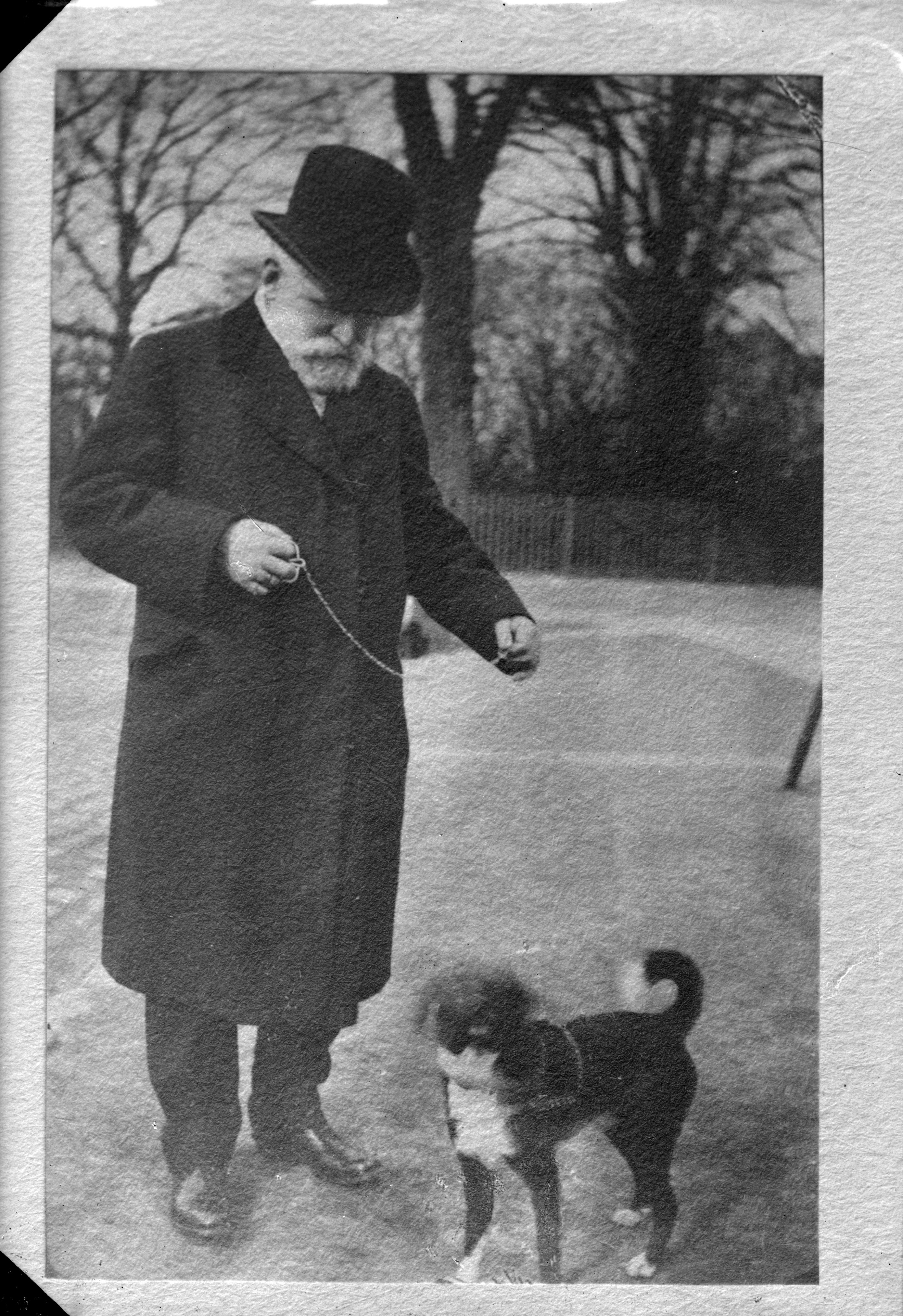 Porträtt i helfigur av grosshandlare Carl Peter Larsson, med sin hund i parkmiljö. Han är iförd hög hatt och lång ytterrock.