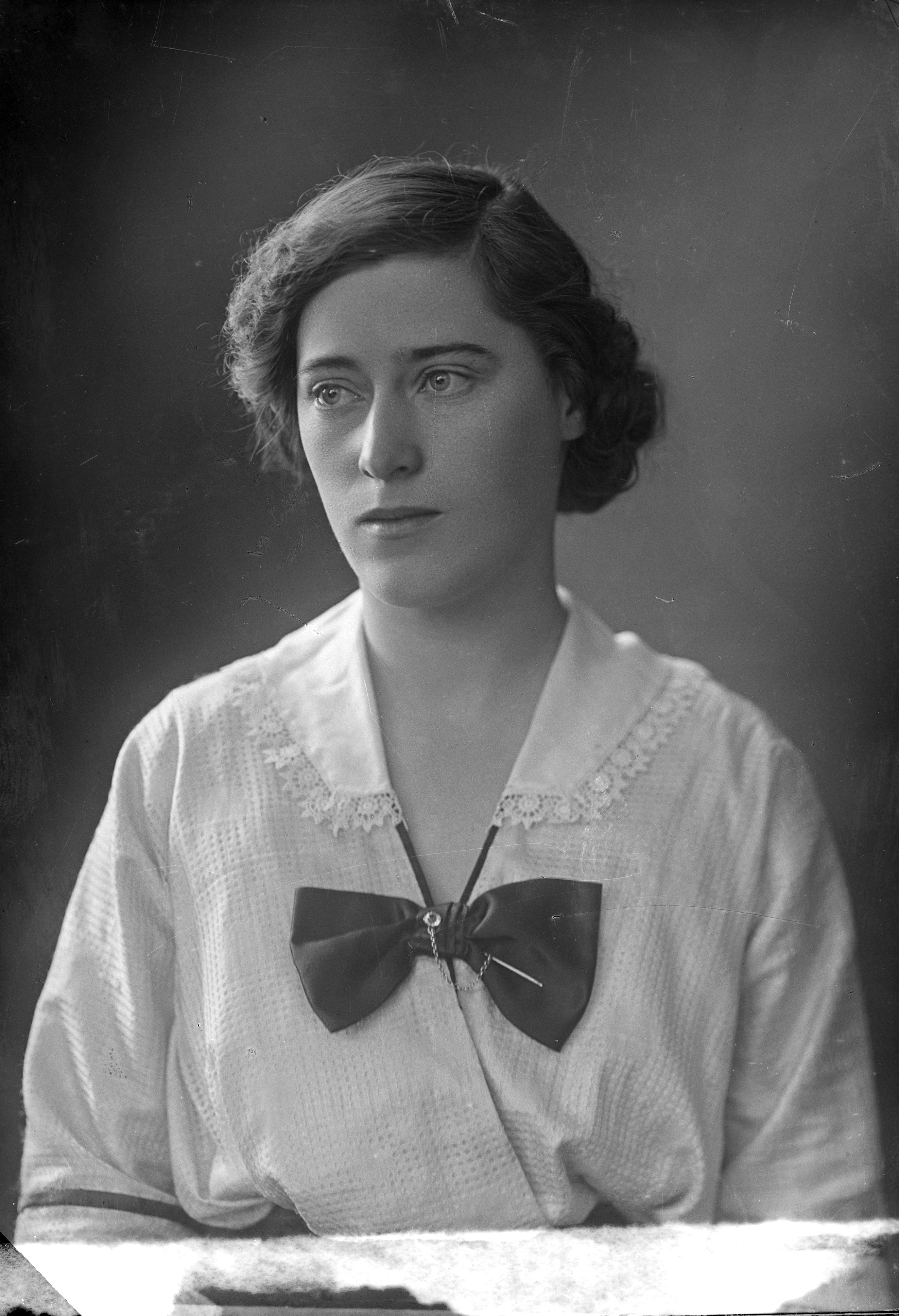 Porträtt i halvfigur av Stella Rydholm i blus med stor, platt rosett. Dotter till grosshandlare Gustaf Hugo Hammargren (1857-1908).