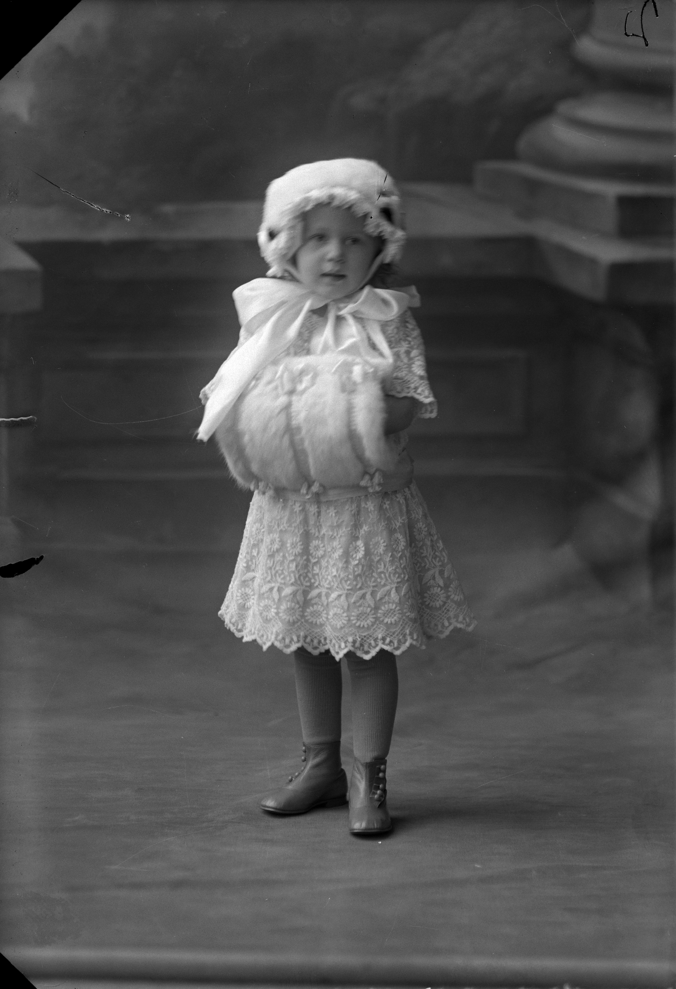 Porträtt i helfigur av Johan L. Larssons dotter kllädd i mössa, hållande handmuff. Ateljéfond med pelarmotiv utgör bakgrunden.