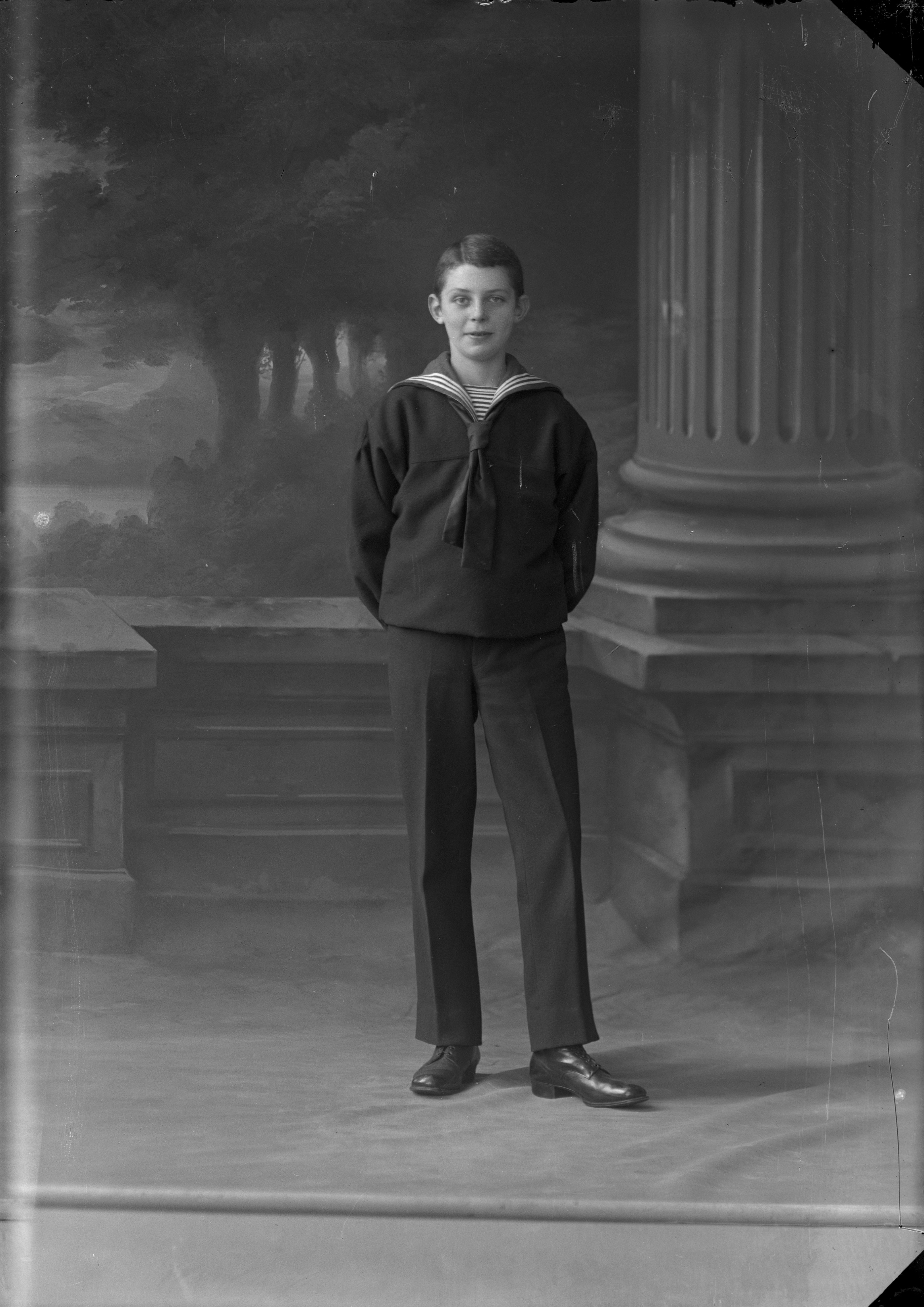 Beskrivning: Porträtt i helfigur av Herman Hernow iklädd sjömanskostym. Ateljéfond med romersk pelare utgör bakgrunden.