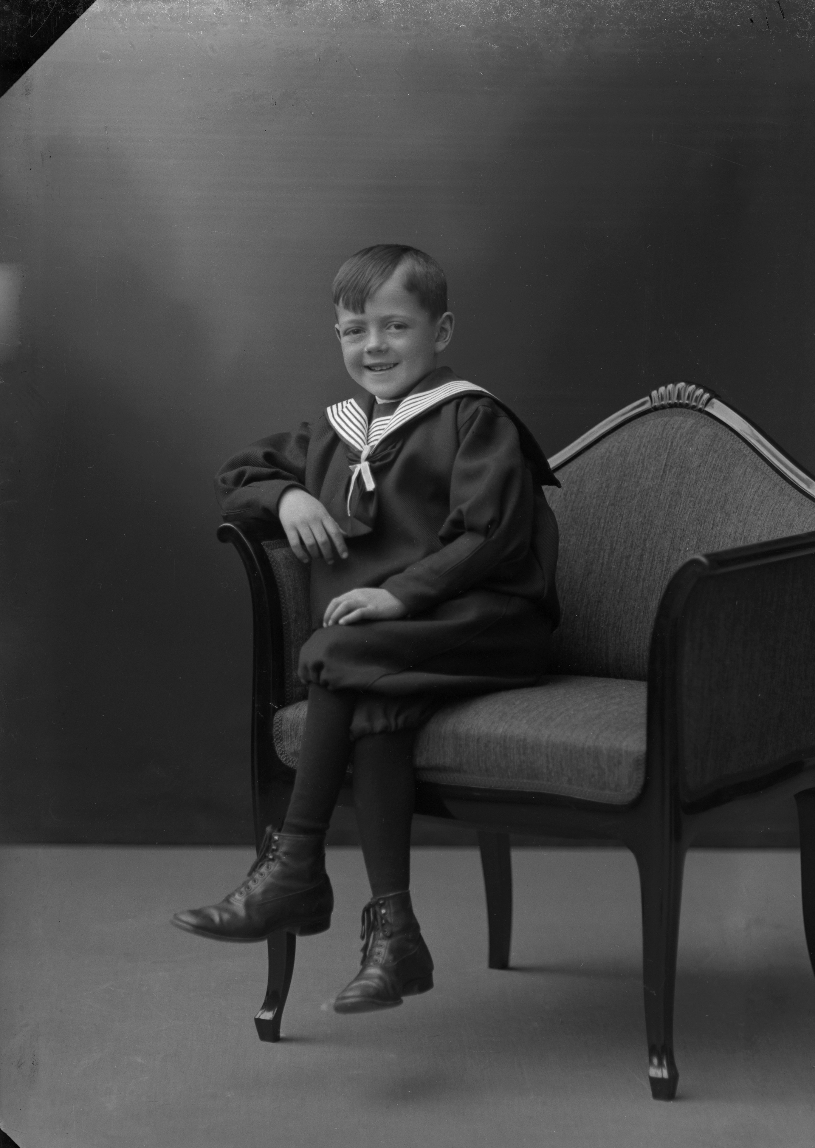 Porträtt i helfigur av Erik Torsson, iklädd sjömanskostym, sittande i stol.