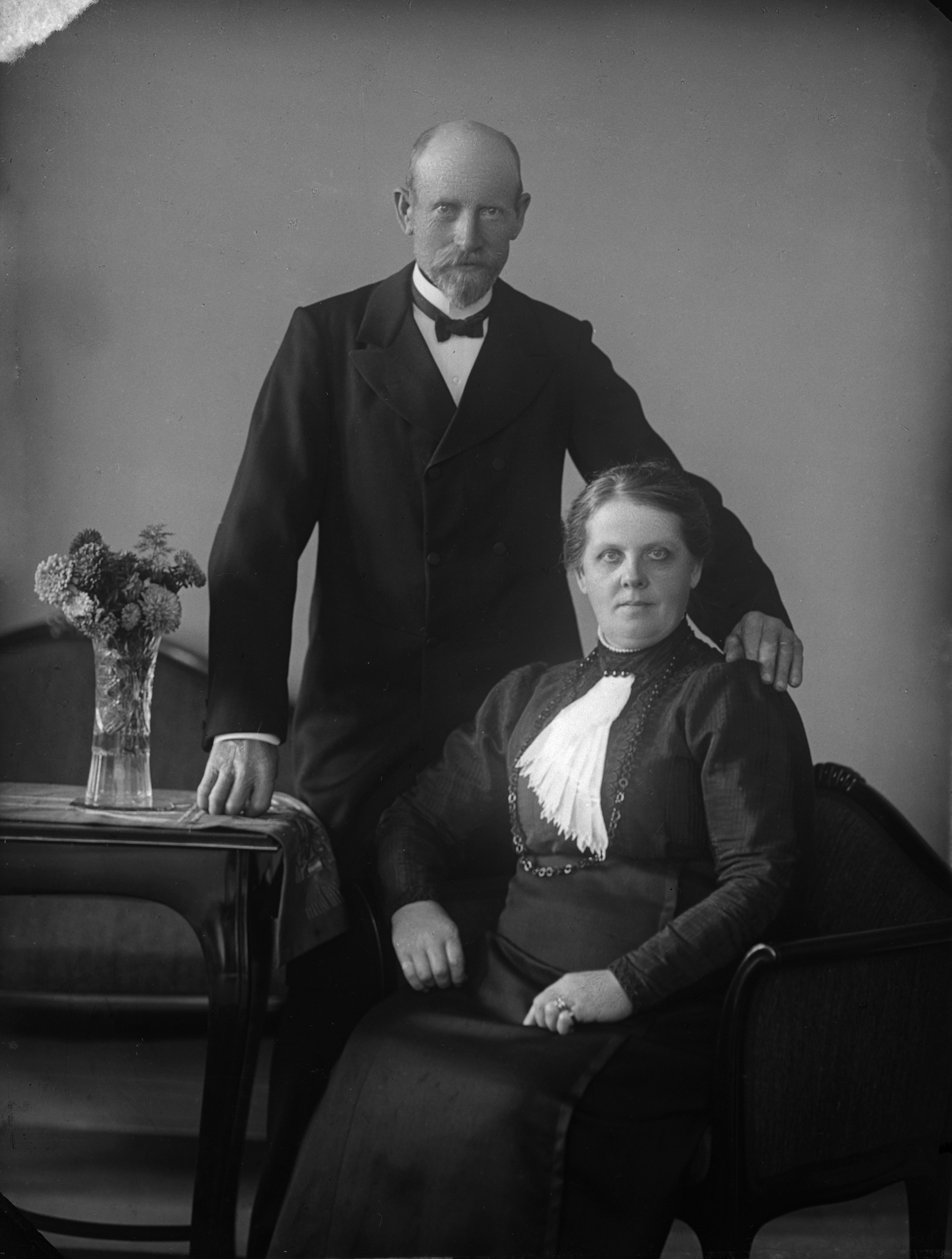 Porträtt i helfigur av her Eriksson med fru. Hon sittande, han stående vid bord med en blomvas på.