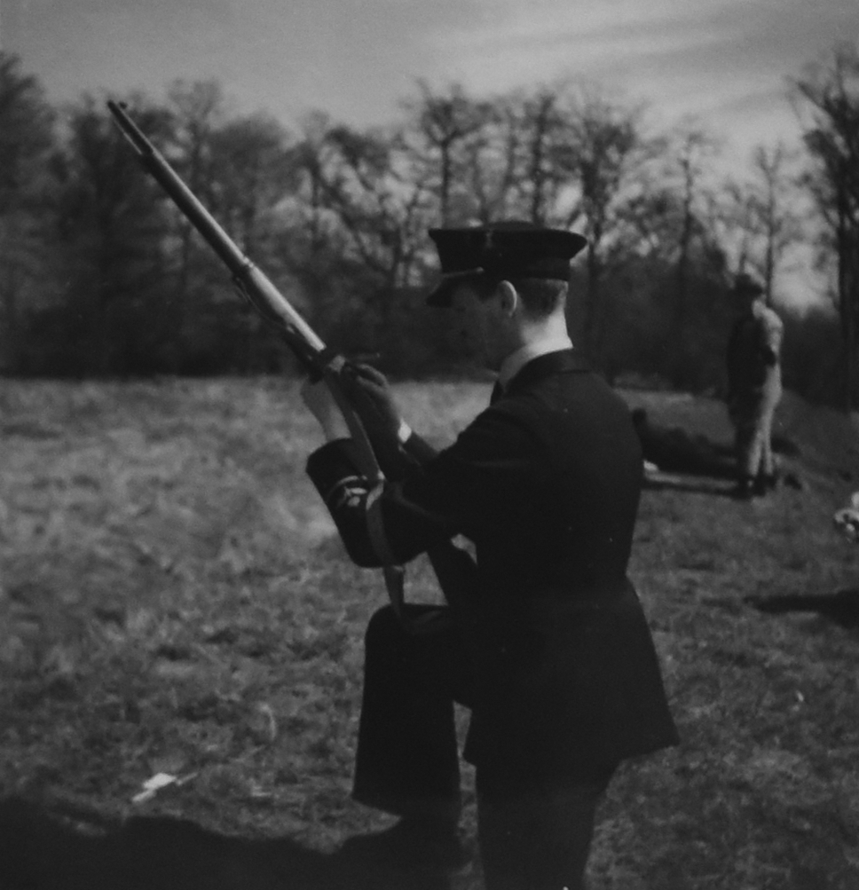 En militär laddar ett gevär vid skjutövning, omkring 1934-1937. Vy snett bakifrån.