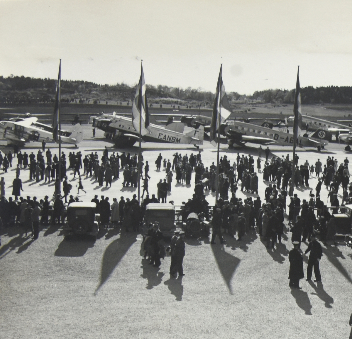 Besökare och uppställda flygplan på flygbanan på Bromma flygplats vid invigningen den 23 maj 1936.