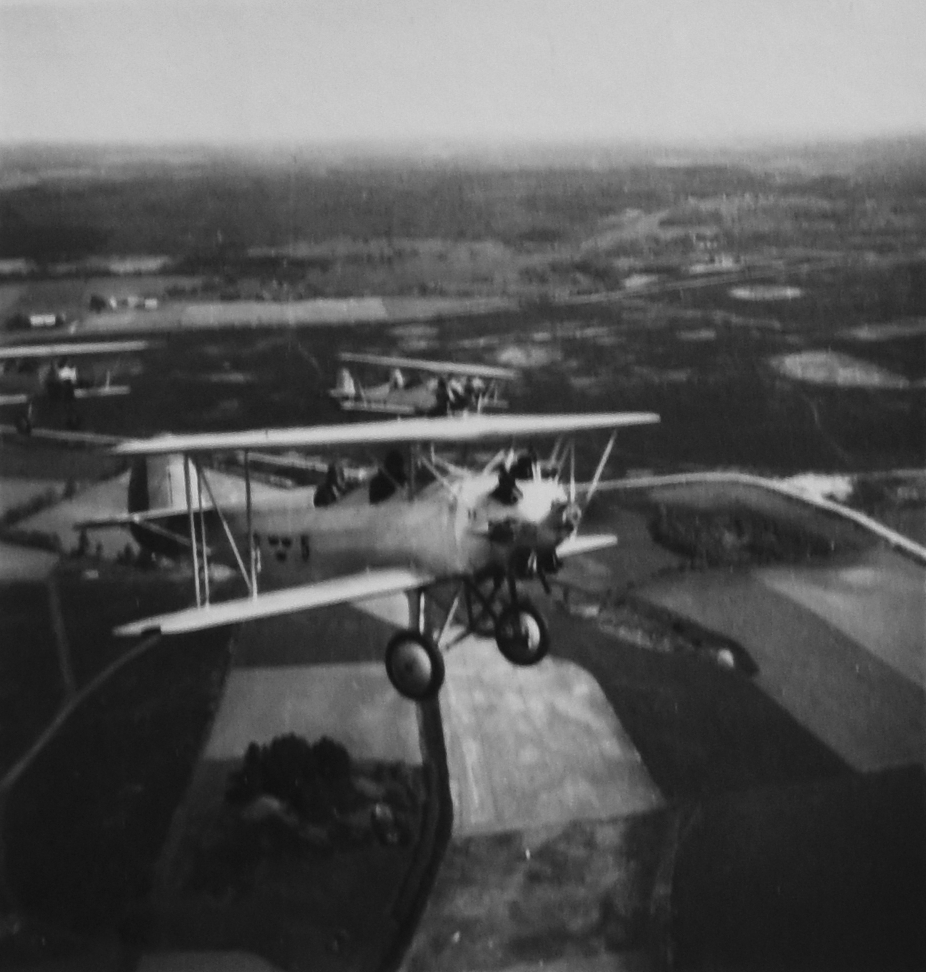 Tre flygplan Sk 10 flyger över odlingslandskap, omkring 1934-1935.