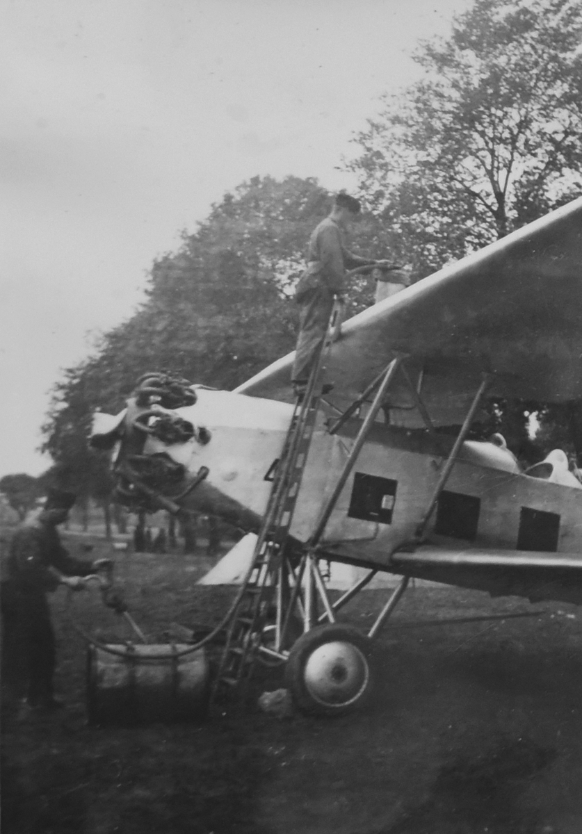 Flygtekniker i arbete med tankning av vitmålat militärflygplan S 6 Fokker på ett flygfält vid manöver i Skåne, omkring 1935-1937.