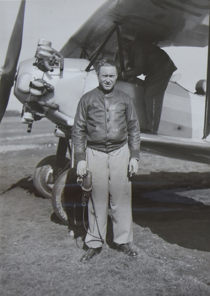 En man med en flygarhuva står framför ett militärt flygplan, omkring 1935-1937.