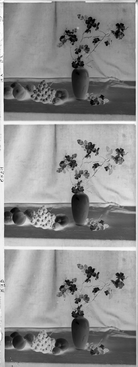 Skioptikonbild från institutionen för fotografi vid Kungliga Tekniska Högskolan. Stilleben. Bilden visar negativ för användning i Chromoskop för direkt betraktande av tre-färgsdiapositiv enligt additiv metod. Använd av professor Helmer Bäckström (och dessförinnan) av docent John Hertzberg som undervisningsmaterial. Bäckström var Sveriges förste professor i fotografi vid Kungliga Tekniska Högskolan 1948-1958. För mer info: se Fotografisk Handbok av Helmer Bäckström. Natur och Kultur. Andra omarbetade upplagan 1958-59. Kap 129 Färgfotografiska metoder - en översikt (sid 965 och följande). (För användning i kromoskop liknande föremålet TM45560).