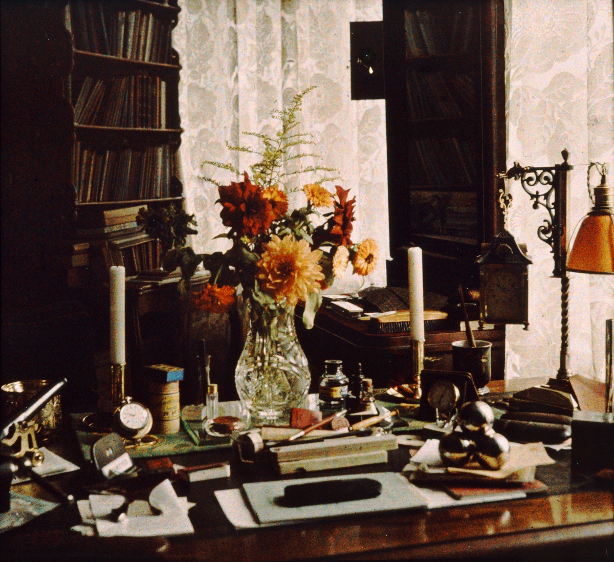 Lumières-autokrom. Läroverksadjunkt Balkes skrivbord.