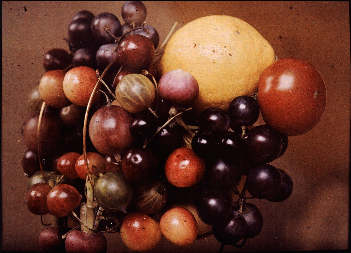 Lumières-autokrom. Stilleben: Körsbär, krusbär, citron och tomat m m.