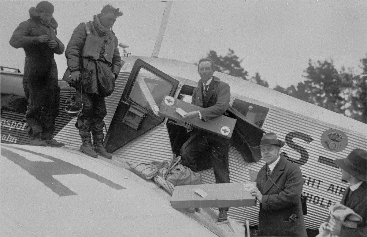 De första nattpostflygningarna i Europa med världens första flygande postkupé. Notarien i kungl. Generalpoststyrelsen Olav Olson vid fönstret. Från Aerotransports nattflygning år 1928.