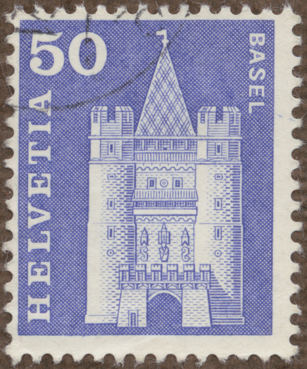 Frimärke från Schweiz, 1960. Motiv av "Gate of Spalen", Spalentor Porten i Basel
