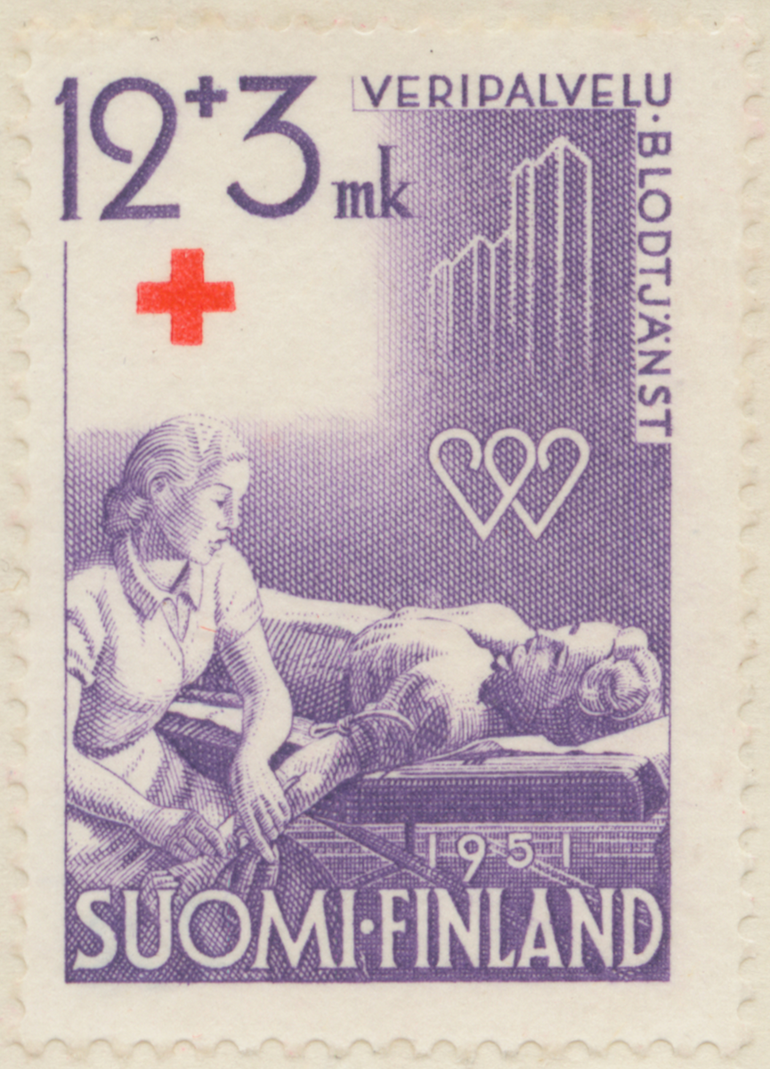 Frimärke från Finland, 1951. Motiv av Blodtransfusion "Serie: Röda Korset"