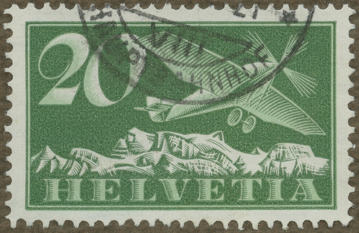 Frimärke ur Gösta Bodmans filatelistiska motivsamling, påbörjad 1950. Frimärke från Schweiz, 1923. Motiv av Stiliserat 1-motorigt monoplan över Schweiziska alper