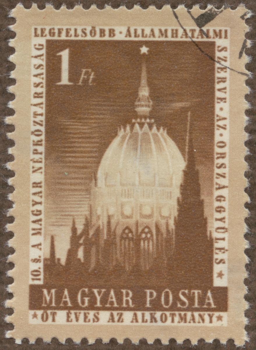Frimärke från Ungern, 1954. Motiv av Kupolen på Parlamentsbyggnaden -5-årsminne av ungerska författningen- 1949-1954.-