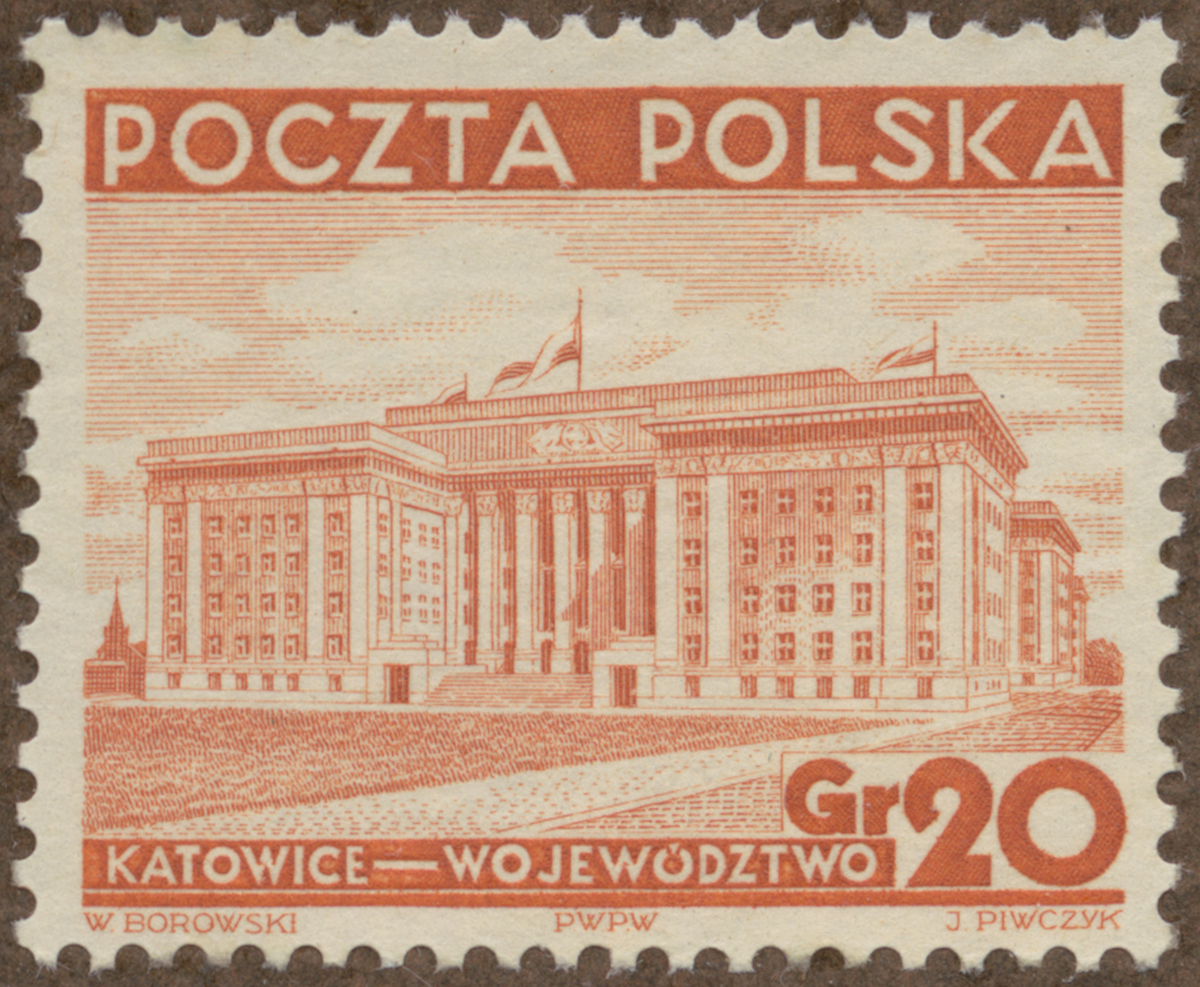 Frimärke från Polen, 1937. Motiv av Kommunal förvaltningsbyggnad i Katowice