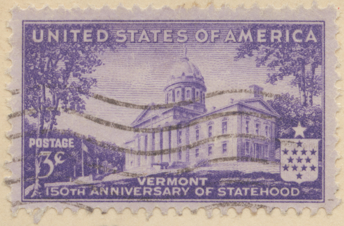 Frimärke från U.S.A., 1941. Motiv av Vermonts Capitolium Staten Vermont 150 år: 1791-1941-.
