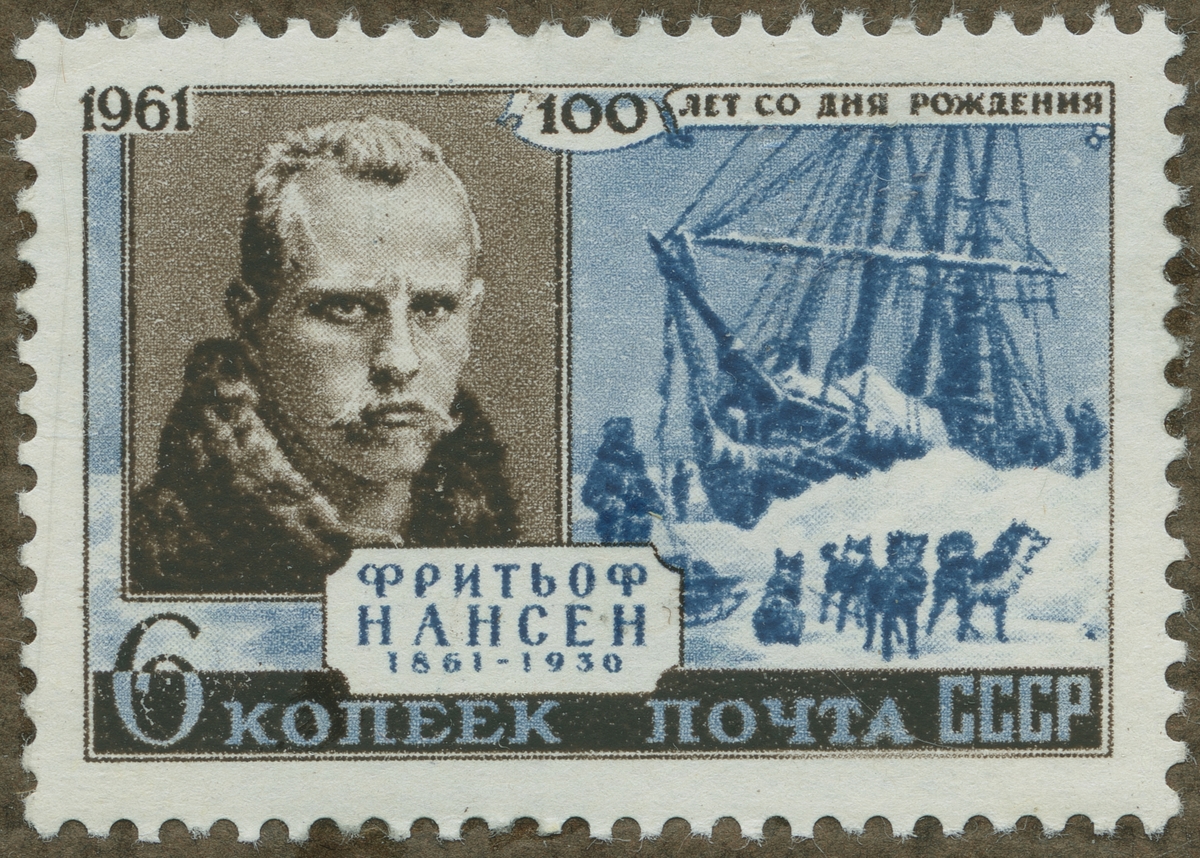 Frimärke från Ryssland, 1961. Motiv av Fridtiof Nansen: 1861-1930. Norsk polarfarare. Naturforskare. Politiker. Uppnådde med skonaren "Fram" o. hundsläde över Polarhavet 86 14´ n.br. 1893-95. Organiserade stora hjälpaktioner för landsflyktiga o. hungrande i Ryssland 1921. Flyktinhjälpen "Nansen pass" 1922, -Nobels Fredspris 1922. -100-årsminnet av hans födelse: 1861-1961-