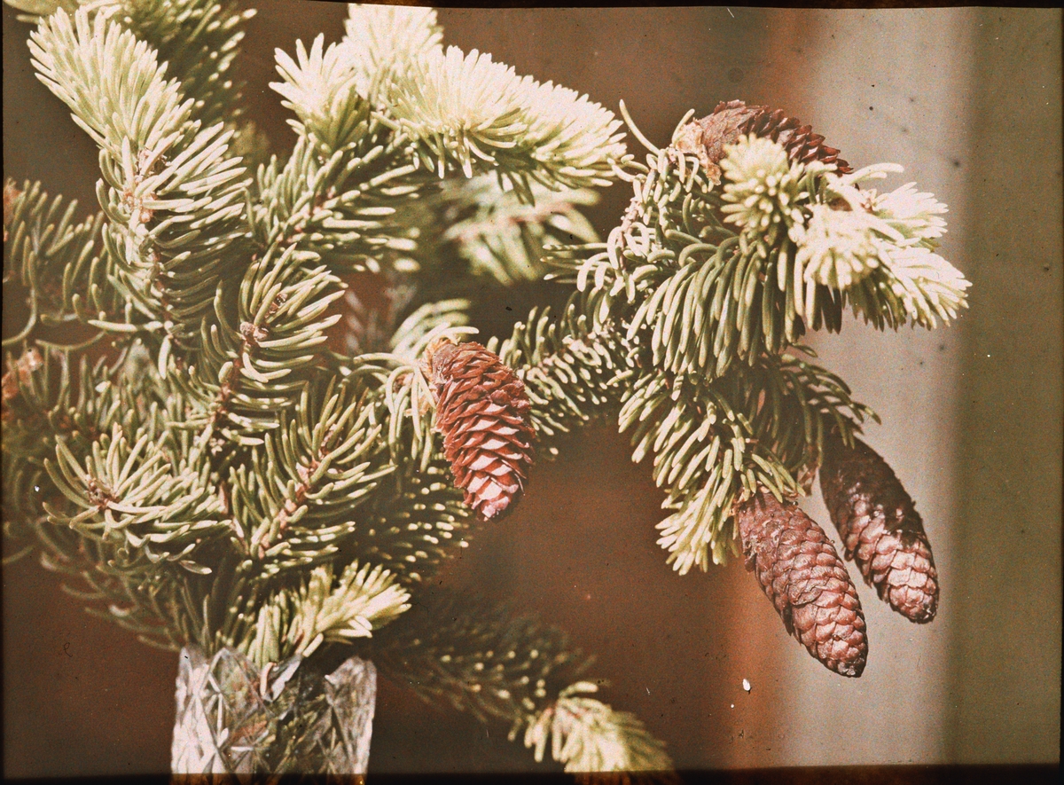 Lumières-autokrom. Stilleben: Grankvist med kottar.