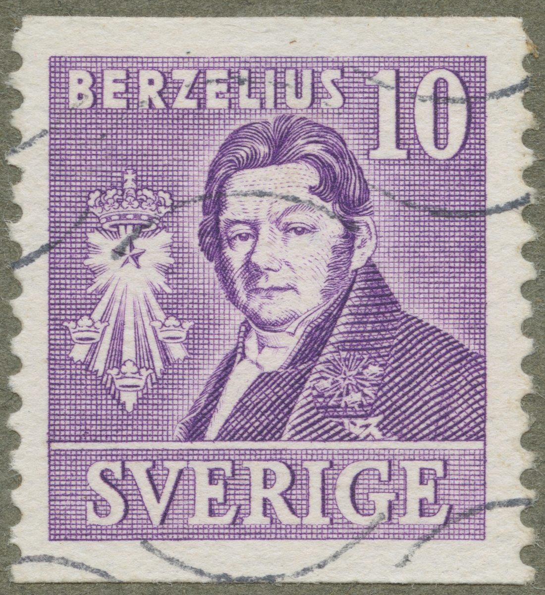 Frimärke från Sverige, 1939. Motiv av Jöns Jacob Berzelius 1779-1848. Läkare. Kemist. Kemiska tecken. Grundämnenas atomvikter. Elektrokemisk teori. författade årligen redogörelser om kemins framsteg i Europa. 200-årsminnet av Kgl. Vetenskapsakademien. 1739-1939.