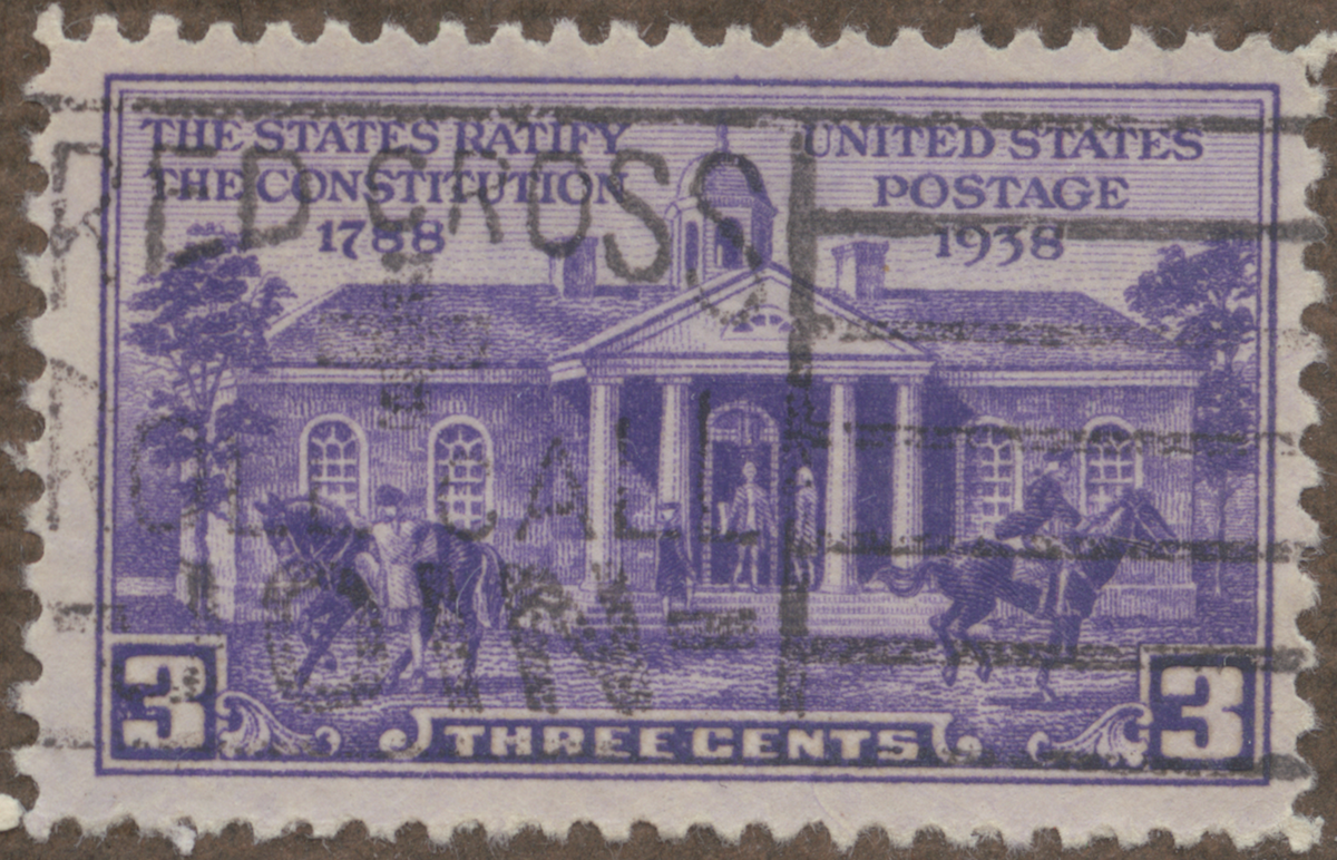 Frimärke från U.S.A., 1938. Motiv: "Reproduktion" av "Colonial type" tingshuset i Williamsburg, VA, den byggnad där Konstitutionen ratificerades år 1788. 150-årsminne.