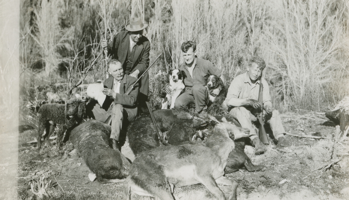 Fotografi från låda märkt Bernt Balchen. Balchen var norsk-amerikansk flygare, polarforskare och militär. Motiv av Balchen och tre andra män som poserar med byten under jakt på Nya Zeeland 1933.