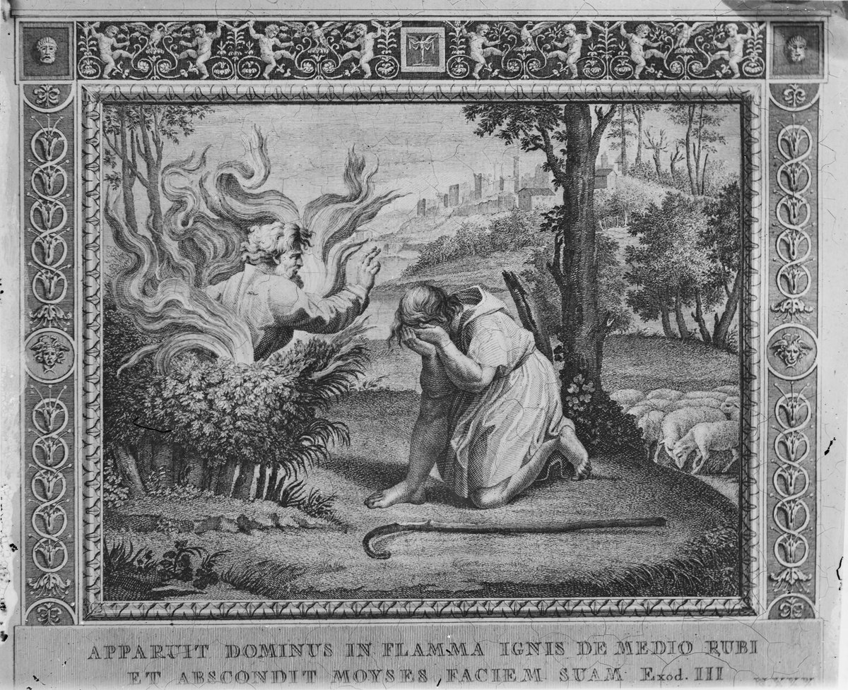 Skioptikonbild. Tryck med motiv av då Herren uppenbarar sig för Moses i en brinnande buske och Moses gömmer sitt ansikte i sin famn.
