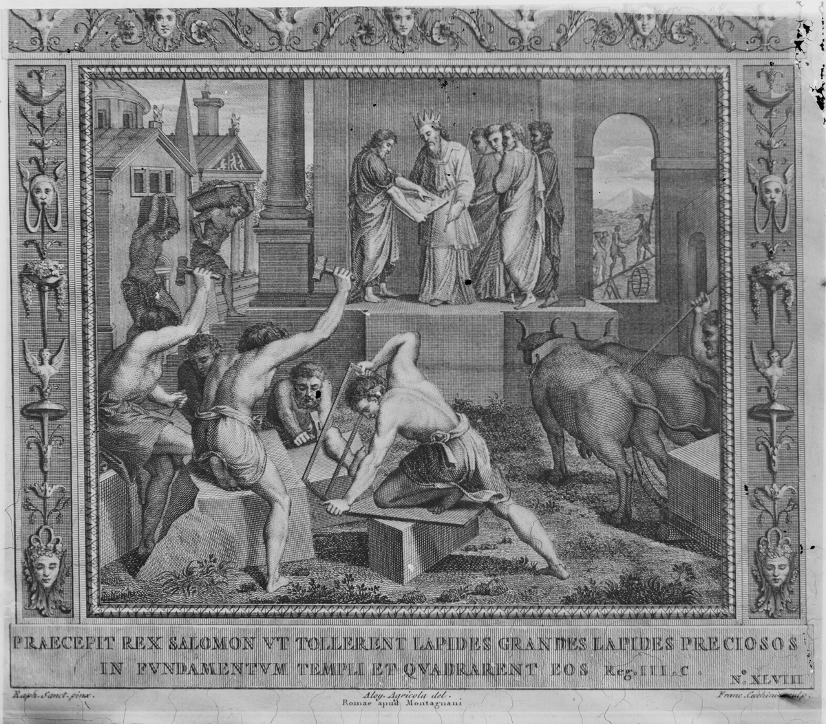 Skioptikonbild. Tryck föreställande Kung Salomo vid grunden av byggplatsen för templet i Jerusalem.