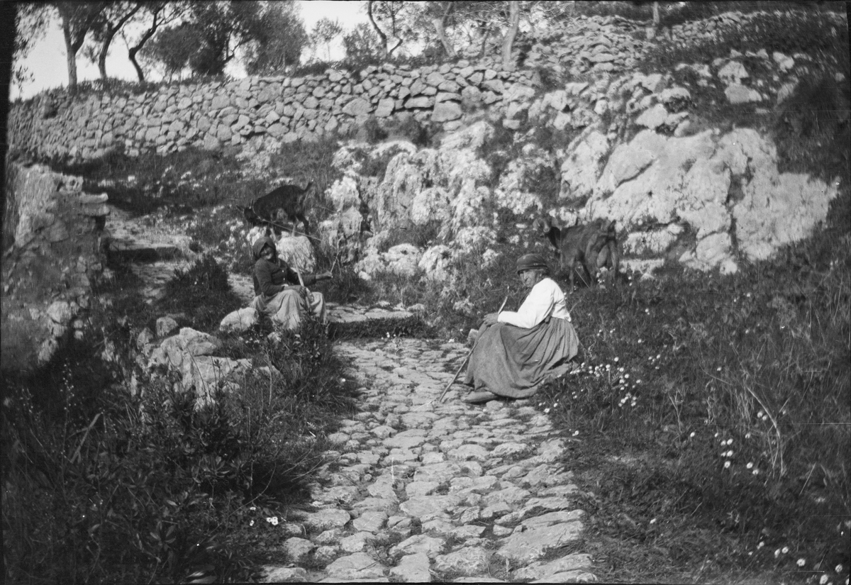 Drottning Victoria bilder. Två gamla kvinnor sittande på stig.