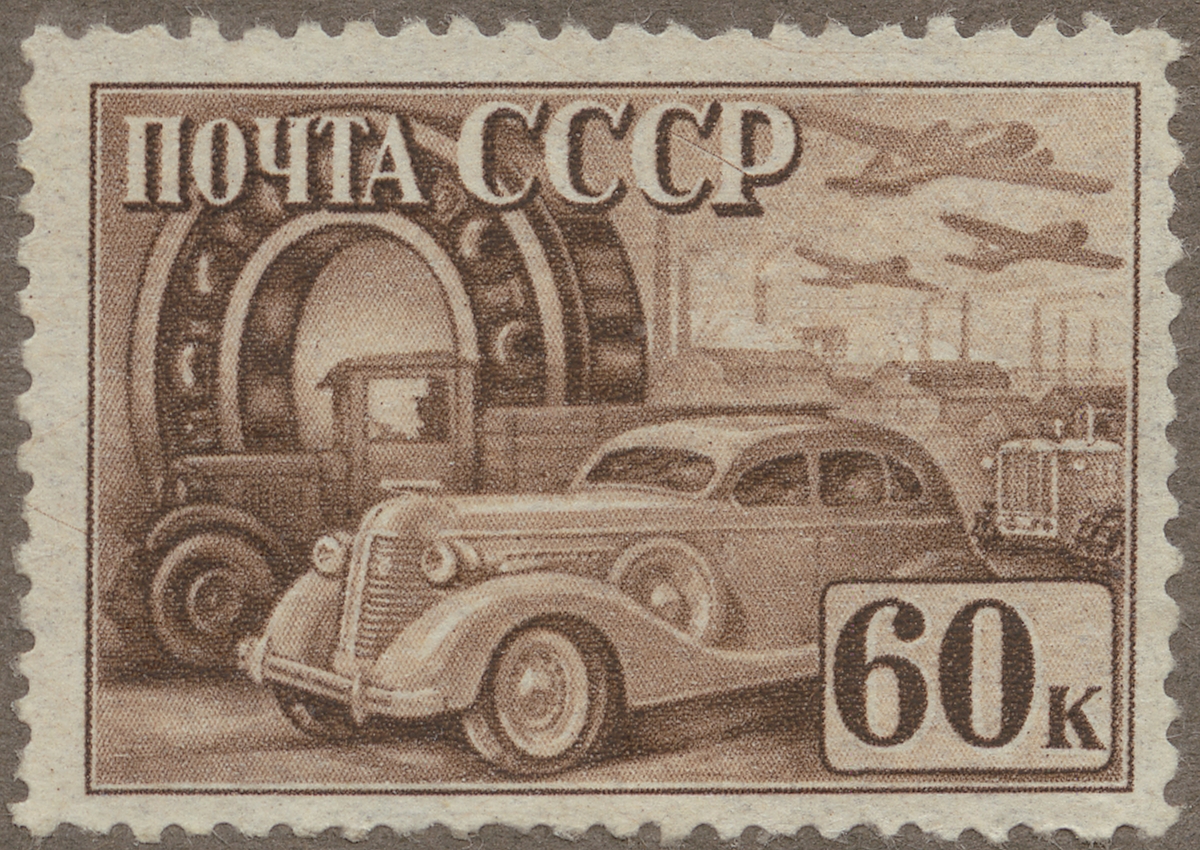 Frimärke från Ryssland, 1941. Motiv av Kullager och dess betydelse för bilar och flygmaskiner. Ryssland 1941. "-Serie-rysk industri-"