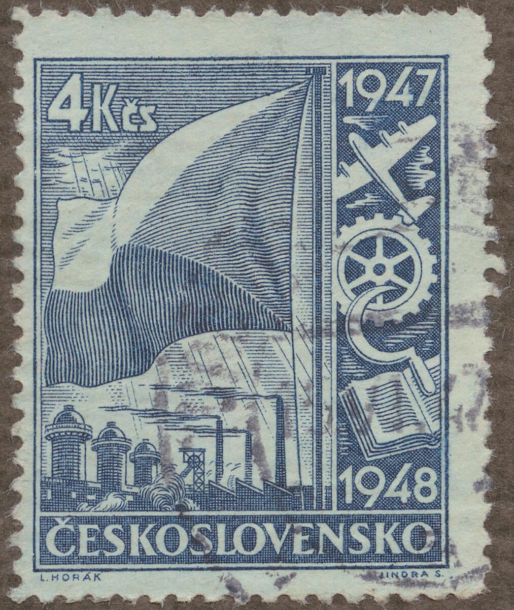 Frimärke från Tschechoslovakiet, 1946. Motiv av Maskindelar m.m. symboliserande återuppbyggnadsarbeten.
