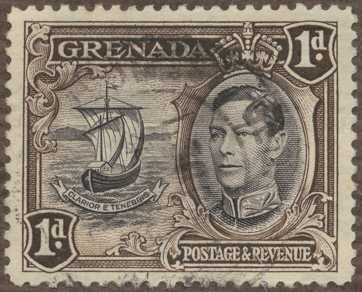 Frimärke från Grenada, 1938. Motiv av Segelfiskebåt: (= Grenadas vapen med inskription "Clarior e tenebris" (Ljus och skugga)