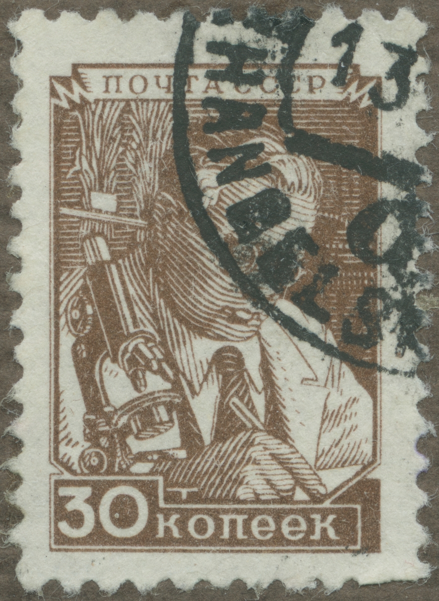 Frimärke ur Gösta Bodmans filatelistiska motivsamling, påbörjad 1950. Frimärke från Ryssland, 1948. Motiv av Vetenskapsman vid mikroskop