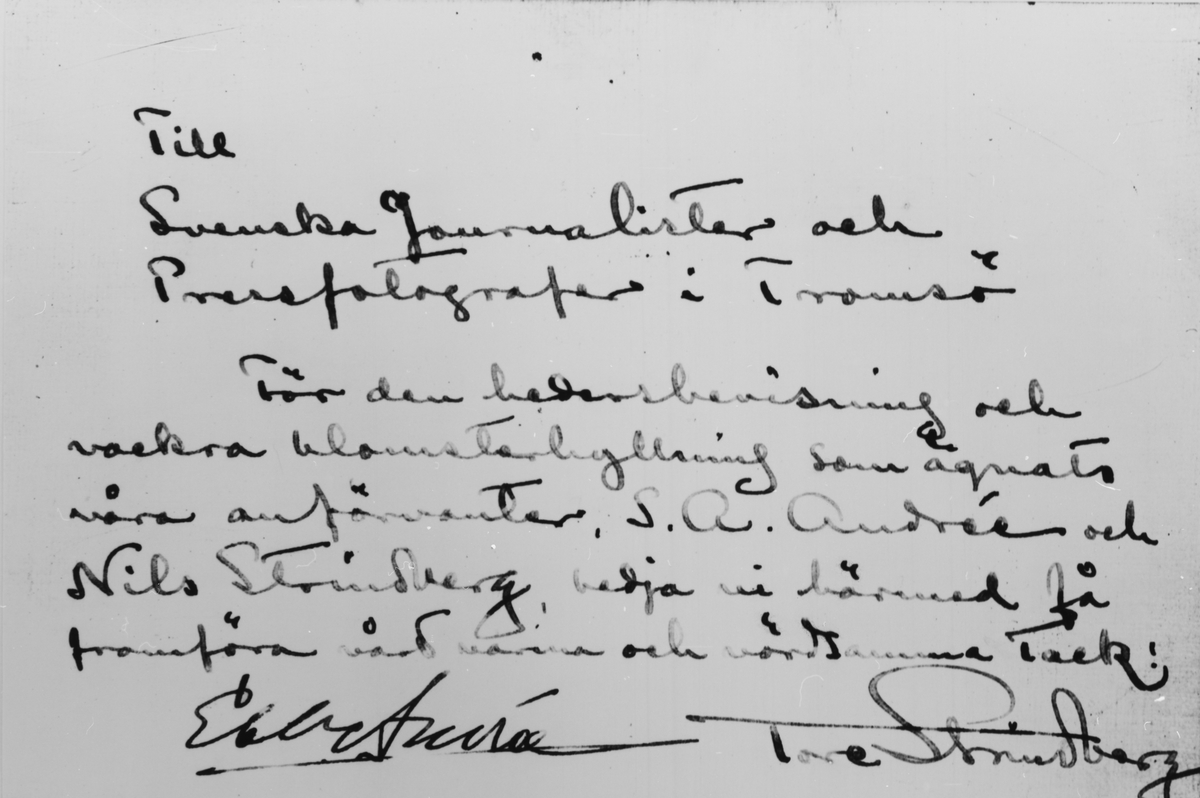 Ett tackkort till Svenska Journalister och Fotografer i Tromsö för hedersbevisning och vackra blomsterhyllning, som ägnats några anförvanter S.A Andrée och Nils Strindberg, bedja vi härmed få framföra vårt varma och vördsamma tack. Ebbe? Andrée och Tore Strindberg.
