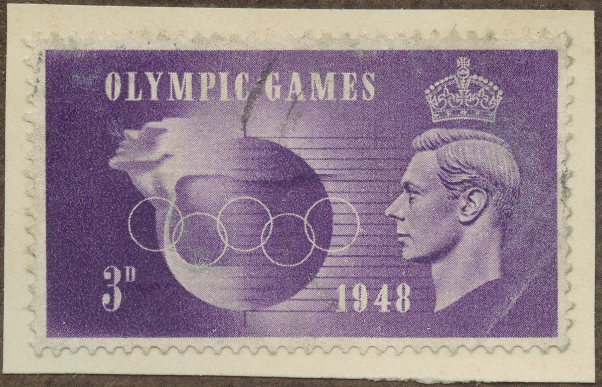 Frimärke från England, 1948. Motiv av Olympiska 5 Ringar Jordglob