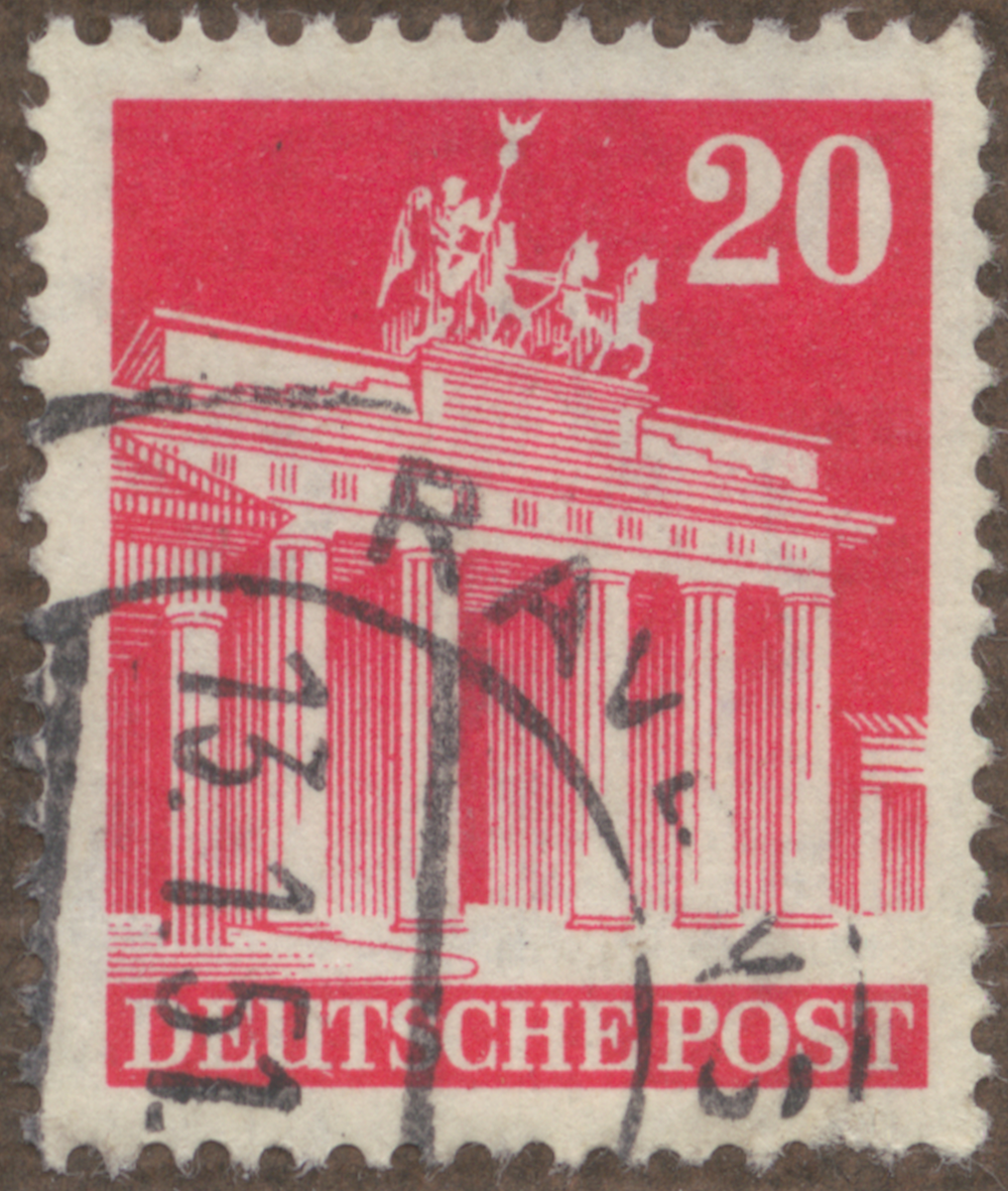 Frimärke från Västtyskland, 1949. Motiv av Brandenburger Tor i Berlin