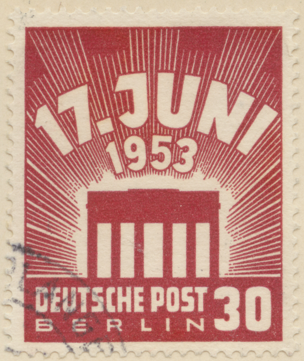 Frimärke från Tyskland, 1953. Motiv av Brandenburger Thor stiliserat Minne av d 17 juni 1953