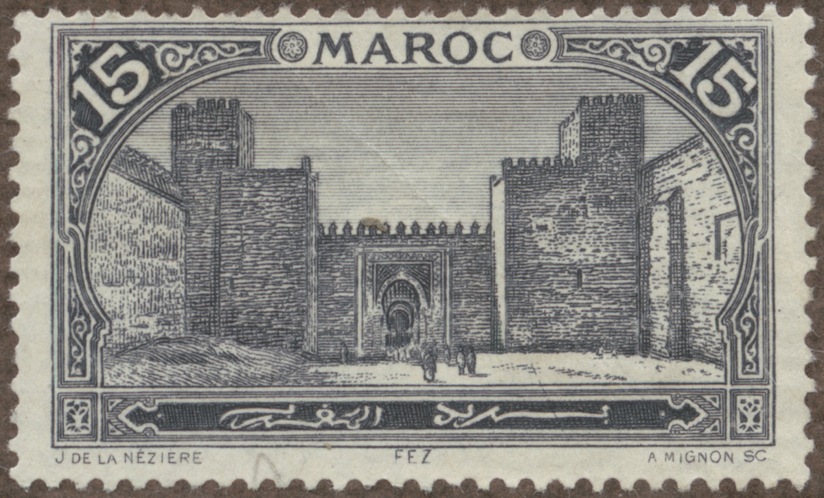 Frimärke från Franska Marocko, 1917. Motiv av Den stora Mechouar-porten i Fez.