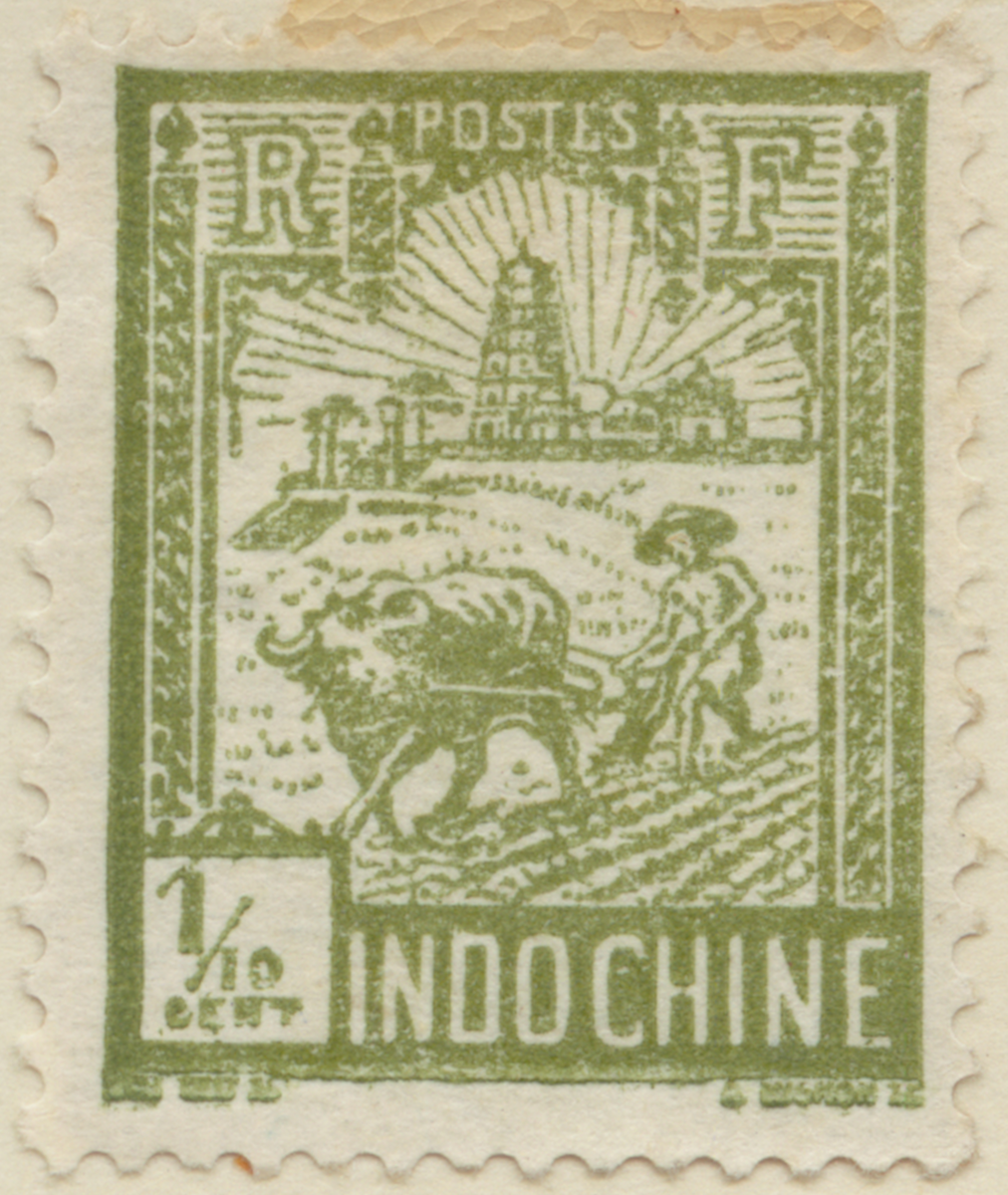 Frimärke från Inokina, 1927. Motiv av (i bakgrunden): Confucius torn - Plöjningsarbete med vattenbuffel-