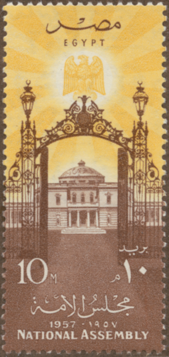 Frimärke från Egypten, 1957. Motiv av Parlamentsbyggnaden i Kairo