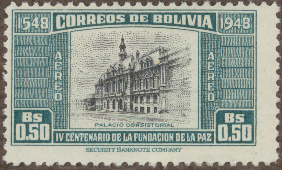 Frimärke från Bolivia, 1951. Motiv av Ecklesiastikpalatset i Bolivia - Staden La Paz 400 år: 1548-1948-