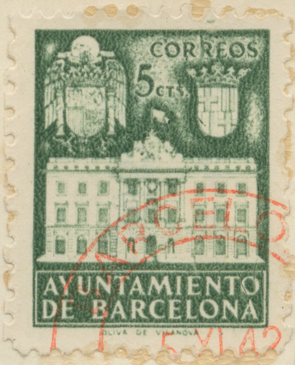 Frimärke från Barcelona (Spanien), 1941. Motiv av Stadshuset i Barcelona
