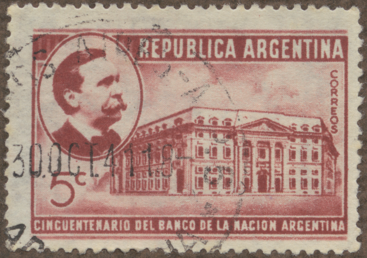 Frimärke från Argentina, 1941. Motiv av Nationalbanken i Buenos Aires 50-årsminne av Bankens grundläggning: 1891-1941. (ovan t.v.): Carlos Pellegrini