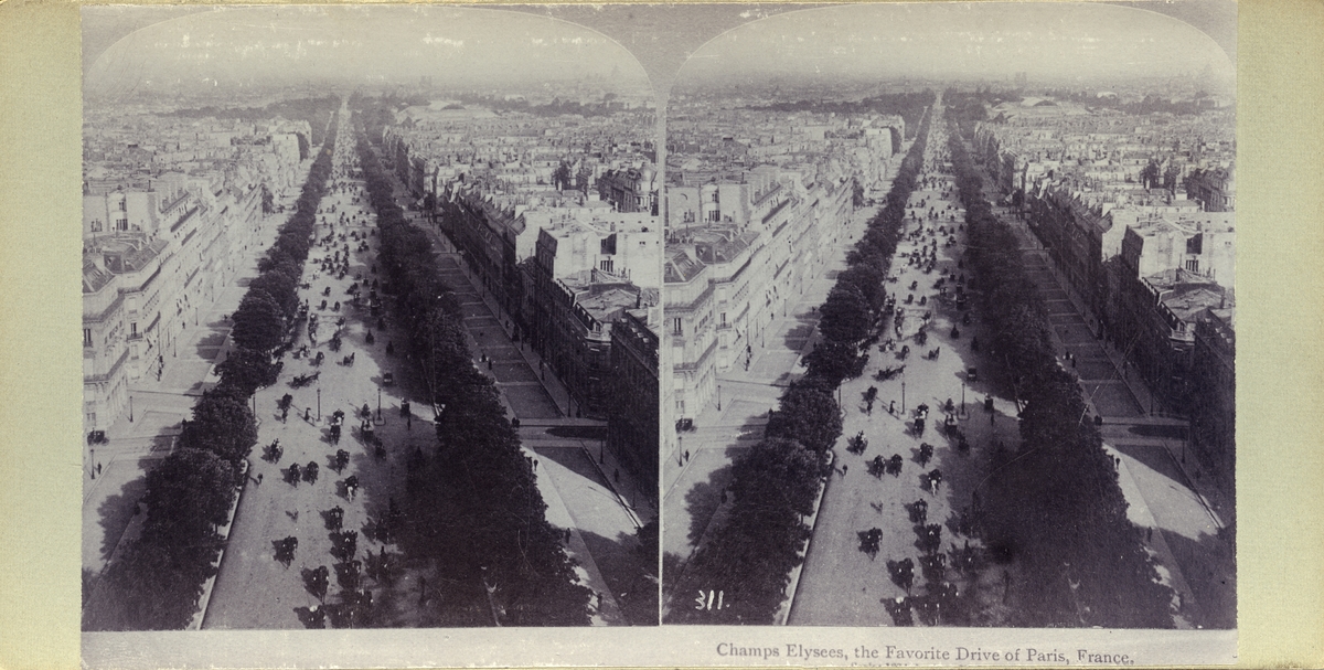 Stereobild med motiv av vy över gatan Champs Elysees, Paris.