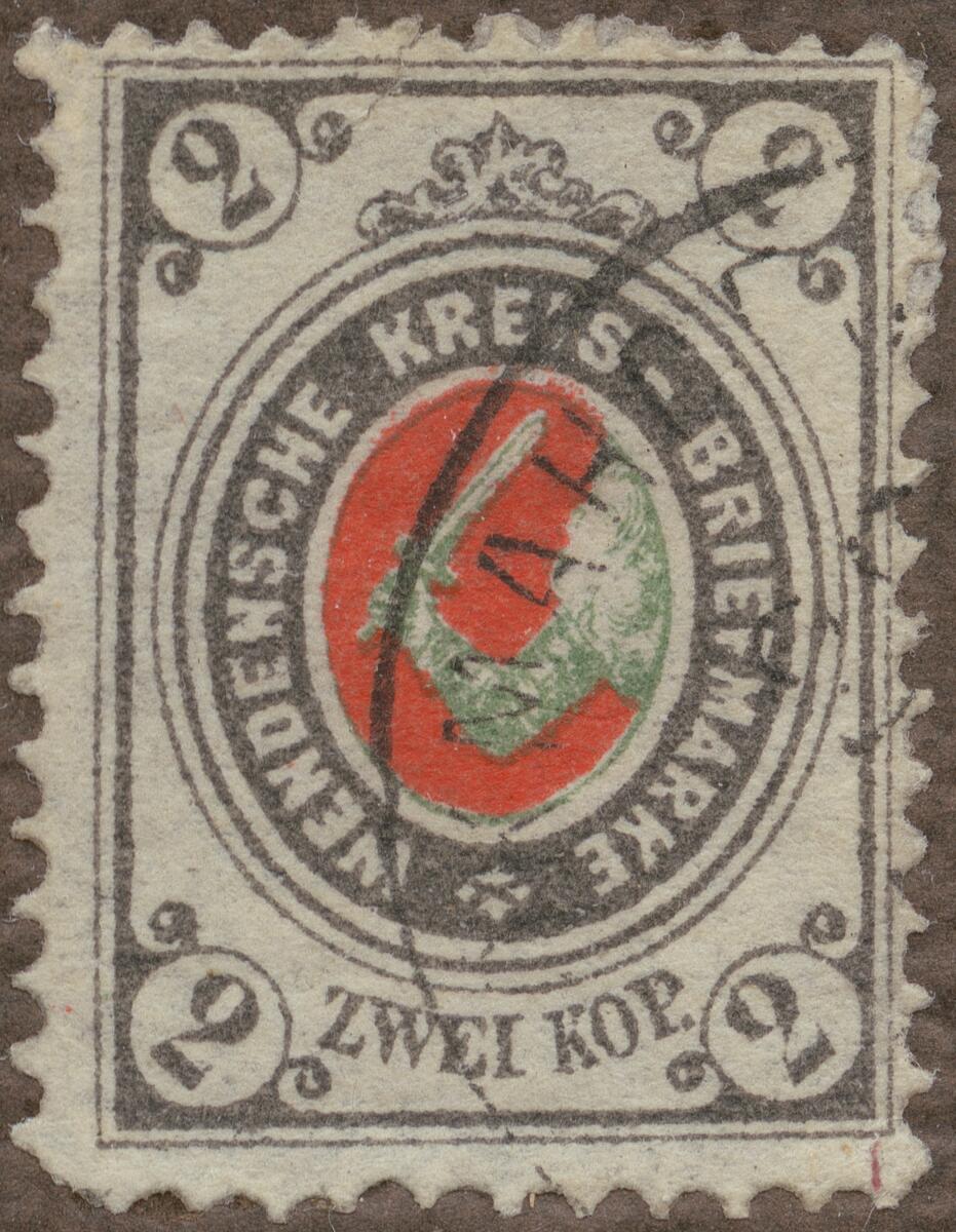 Frimärke från Wenden, 1884. Motiv av Vapen Svärd Wenden (Wenden, förr tillhörande Litauen, då denna var del av det ryska kejsardöme, blev senare införlivat med Lettland under