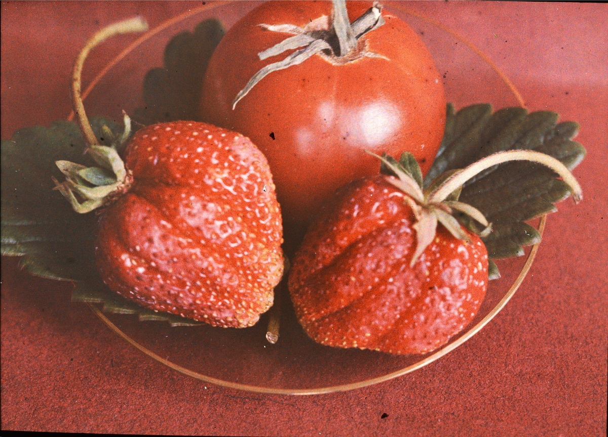 Lumières-autokrom. Stilleben, två jätte jordgubbar och en tomat.