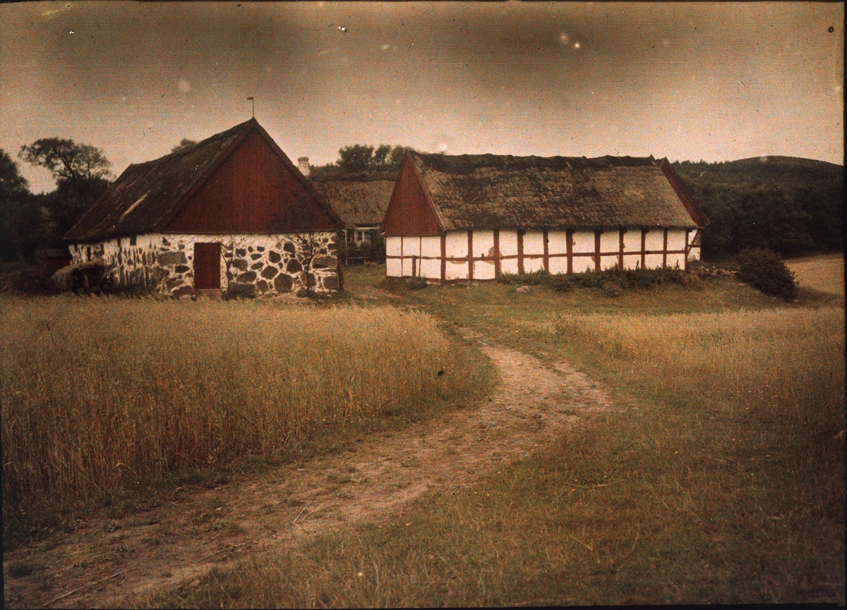 Lumières-autokrom. Sommarnöje vid Arildsläge. Hus med halmtak. Fotograferad aug. 1912 med f/12, 18 sek. exponering.